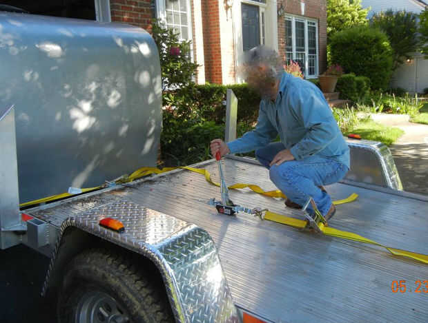 - Levantar la cabina y había cargado en movimiento dollys en el garaje y uno de los tirantes se deslizó a través del Ubicación del amarre frontal y conecta el lazo abajo a un par de ven-alongs para tirar lentamente de la cabina en la cama del remolque.