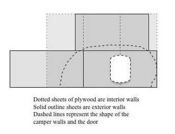 - Además dado que el tamaño del cuerpo de camper (gran caja curvada) era más grande que una sola hoja de madera contrachapada y no quería que la madera contrachapada a tope las costuras que se traslapan en el interior y exterior esto significa que es necesario superponer las hojas de madera contrachapada para que el interior tenía 8' lado de la madera contrachapada que va vertical y los lados exteriores fueron trazados horizontal. Al principio supuse que habría mucho de madera desperdiciada con este enfoque, pero terminó utilizando la madera extra más adelante en el proyecto.