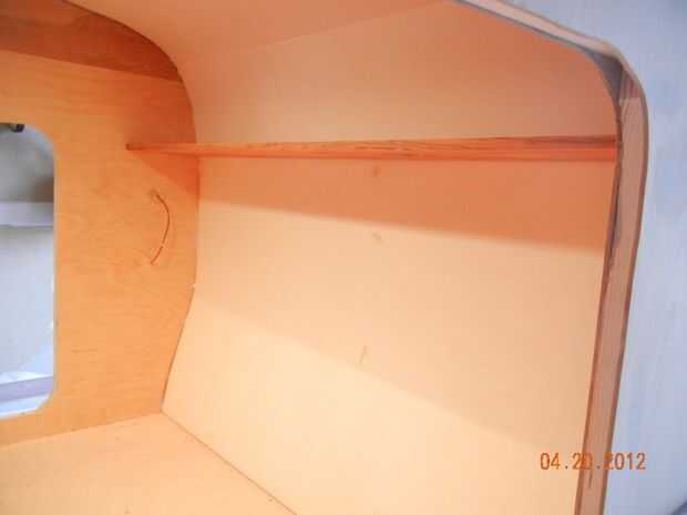5. Durante esta etapa también hice un estante - 3/4 "x 10" x 70 "que fue montado en el frente de la cabina. Esto se colocó así que sería conveniente llegar hasta mientras tendido en la cama y poner botellas de agua, gafas, libros, etc. para la noche de lectura. La plataforma fue recortada a 69 3/4" para caber en la cabina.