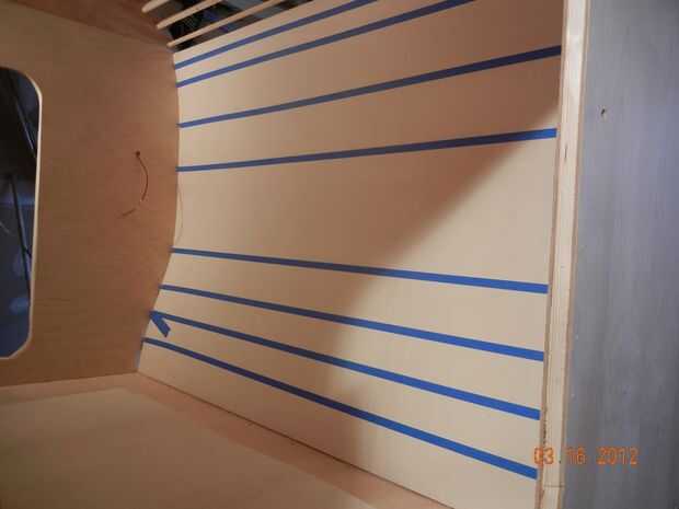 2. La primera instalación de la pieza era fácil - fue desde el piso de la cabina delantera hasta 4 pies. Las curvas de esta pieza eran bastante simples y es fácil de instalar. Corté el pedazo, seco lo equipado y verificado correctamente, cabe agregar en dos puntales extras para la parte inferior y superior de la madera contrachapada a. Encendió el compresor de aire y cargar a la clavadora de acabado con clavos de 1", unte pegamento en todos los puntales, empujó la madera contra las costillas y los bloques de sujeción para sostener la madera apretada contra las costillas hasta que el pegamento seca.