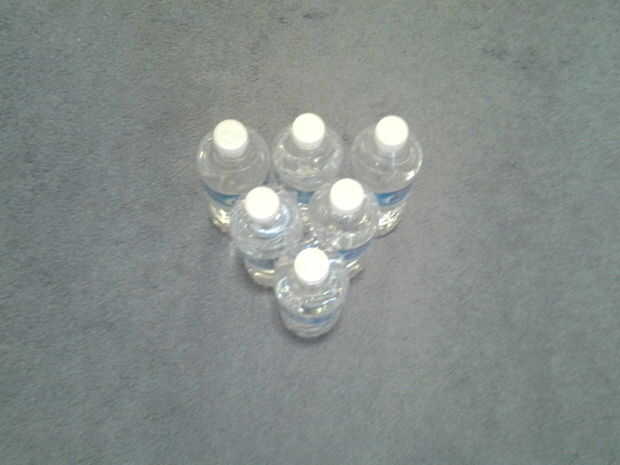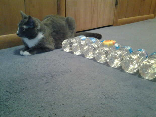Usted necesitará un teaser de láser, botellas de agua (se muestran algunos arreglos para hasta siete) y un gato.