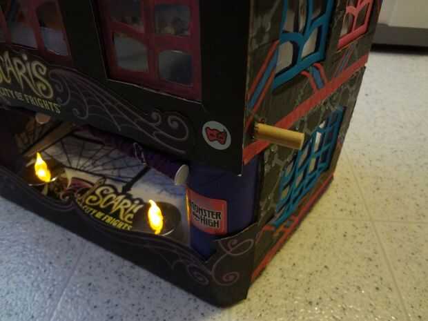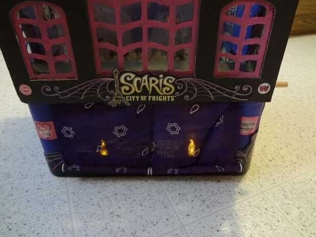 I comenzó a esbozar la forma de un pedazo de cartón y cortar 3 piezas iguales para formar las paredes interiores y exterior. La pieza inferior corto los agujeros para las 2 luces led por lo que podría llegar a los interruptores de encendido/apagado. Cortar las piezas de pared interior y exterior y utiliza cuchillo del exacto y tijeras para cortar los puntos para las ventanas y caliente pega hojas de plástico en los. He utilizado perforadora & tijeras pequeñas para cortar foam cristales hacia fuera para pegar en las ventanas de plástico con pegamento elmers. Yo también utilizó papel scrapbook texturizado negro para el cristal de la ventana superior trasera y utiliza elmers pegamento para sujetar en su lugar. De solía la cubierta de tabla de papel temático alta monstruo las paredes cartón con él la línea diseño de embarcaciones pegando a los varios pedazos de cartón. También usé el embalaje de una muñeca de monster alto para hacer el interior fondo caliente pegado en lugar de la etapa. Usé el cuchillo del exacto para cortar las ranuras encima de las ventanas se deslice los títeres de papel de corte a través. Los títeres son simples recortes de personajes alta monstruo que están pegadas a la cartulina pesada y corta. Utilizar pegamento caliente para pegar los títeres en el multi coloreada craftsticks. He utilizado un taco de madera como el soporte de cortina de teatro que sería subir y bajar la cortina, simplemente girando. Usé las chinchetas y pegamento para sujetar la cortina a la espiga. Dejé el techo abierto como sea posible para que los títeres se pueden mover en y fuera del teatro por la parte superior. Yo usé palitos y pegamento para sujetar el cartón del techo para hacer la parte superior del teatro fuerte y proporcionar un buen punto a la vida de. El libro de la etiqueta engomada tuvo algunos divisores de cartón con imágenes de alta monstruo usé los de las escenas del piso superior e inferior. Hice algunos casilleros en forma de ataúdes y pluma usada para algunos detalles y utiliza algún material de la cubierta de mesa para decorar los casilleros más. Otras piezas del teatro está decorado con piezas de la cubierta de la mesa así. Entonces utilicé las pegatinas para añadir las decoraciones acabadas hasta los palos teatro & títeres.