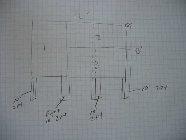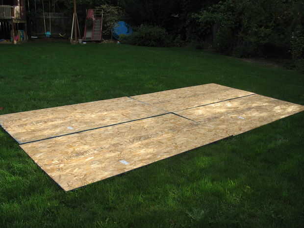 Como dije antes, la visión era una pantalla de 8' x 16'. Una vez que se burlaron de esto para arriba con las 4 hojas del OSB, comprendí rápidamente hubo absoluto puto podía levantar esto y que con seguridad permanecer vertical, sin comprar más madera. Cambio de planes... 8' x 12' es manejable y aún un tamaño impresionante para un patio.
