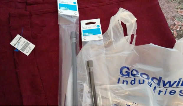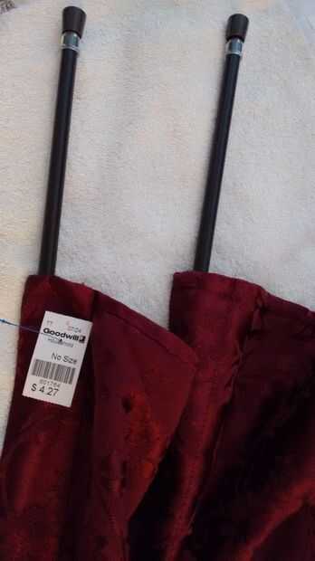 Golpe de buena voluntad para la cortina y anotó un panel de cortina largo agradable, apropiadamente teatral Borgoña coloreada 6 pies para $4,27. El panel de cortinas fue uno de los diseñados para puertas o algo similar, con bolsillos (mangas) de la barra en la tapa y el fondo, lo que es perfecto para mis necesidades para el teatro de la puerta y haciendo una 2ª cortina innecesarios en mi caso.