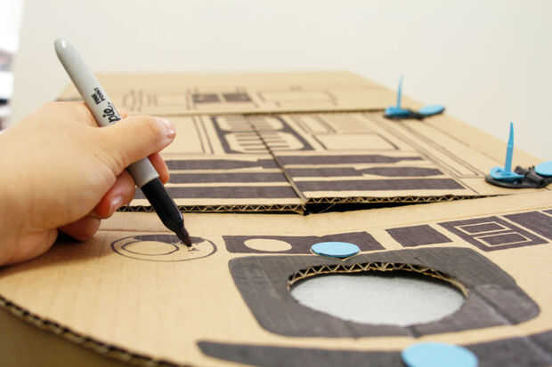 hice un pequeño teatro de marionetas de una caja de cartón. Sólo requirió tres cortes y alguna cinta fuerte, ningún cartón adicional era necesario.Materiales: caja de envío de cartón resistente, navaja, regla de metal, pluma o marcador, cinta fuerte