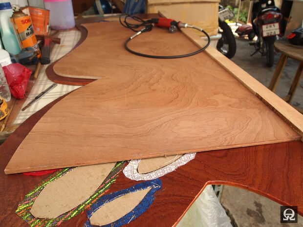 Se ha añadido vigas de 4.2 x 1.7cm en el lado donde las bisagras serán y también cortar algunas hojas de madera para cubrir el desorden con la tela.