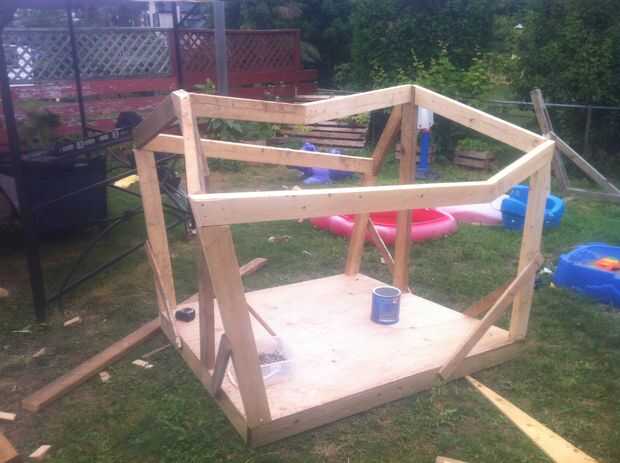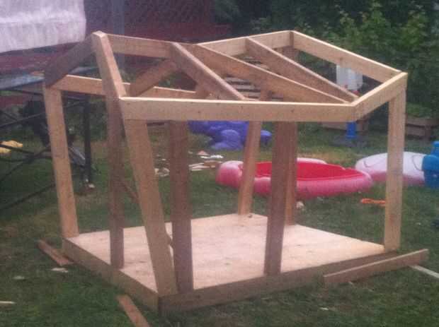 Para construir el techo, he instalado dos soportes en las paredes laterales. Un lado he añadido extra cortado para permitir que esa pared a 'torcer'. Mi canto de techo consiste en una sola 2 x 4" con un corte y montado para crear un 'fuera de línea', línea de techo loco. Lo hice con la parte superior de la pared en la parte frontal para que las cosas no parecía demasiado rectas. Agregar vigas según sea necesario. Usted debe tener una viga en cada cadera y Valle (donde los cortes son en canto y placas de pared) y se recomienda no más de 2'.