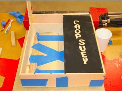 1. Comience con el inserto de madera de fondo (yo usé cinta de pintor para conectar todas las tablas para que sea más fácil) hasta los cuatro lado y coloque los tableros de madera inserto inferior la línea. Aplique pegamento a los bits que necesitan y abrazadera.