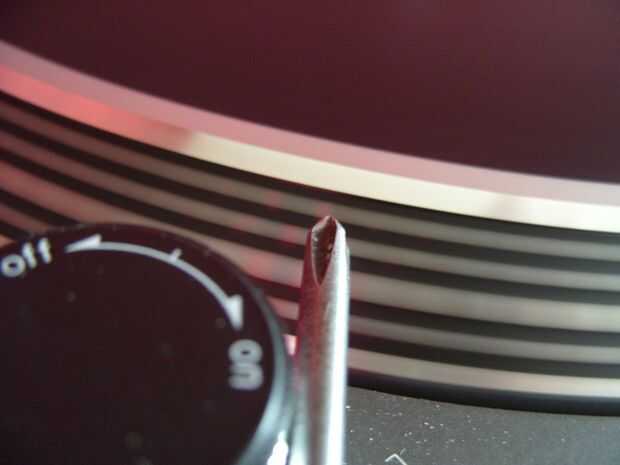 ¿OK, la tapa y el plato están en el lugar? Conectar el giradiscos a la red eléctrica y encenderlo. Coloque el cursor de pitch a + 6%. Comenzar el plato. Echa un vistazo a los puntos en el plato cerca de la luz estroboscópica en el interruptor de encendido/apagado. La fila superior de puntos representan + 6% pitch.