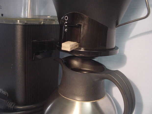 Hace muchos años, hice una cuña bilateral de "prototipo" en bajo el interruptor y permite un mayor control del flujo de café de la cesta. Es una caja de trigo triturado (cartón prensado) disecado y laminado con pegamento de caucho. Después de una década, el extremo que se topa en la cesta ha delaminación levemente y parece bastante ratty, aunque todavía funciona.