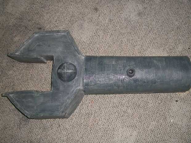 Para hacer el brazo me lió una pieza de espuma de camping hasta que era del tamaño y longitud que quería y gorila pegan las cuatro o cinco pulgadas de superposición pesadamente. Corté dos pequeños agujeros a opposide lados del cilindro donde quería una manija que e inserta un pedazo de tubo PVC a través de ellos. Grabado cierre los extremos del PVC de la pipa y ponen pequeños trozos de tubo de espuma en las puntas para crear la apariencia de un tornillo grande.