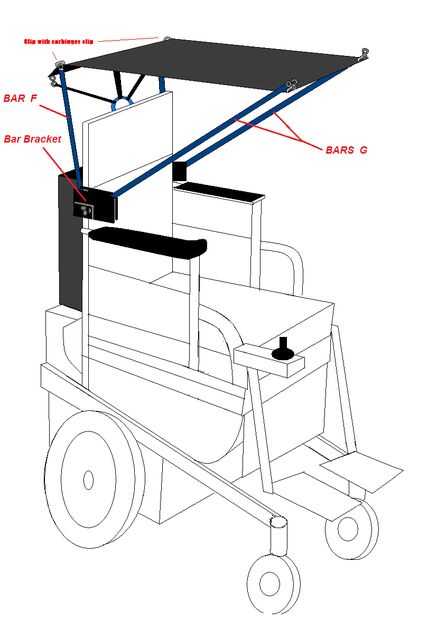 En la ilustración, el soporte se etiqueta y se muestra como conectado a la silla de ruedas. Este soporte puede ser adjunto superior o inferior dependiendo de lo que funciona para un modelo de silla de ruedas especial. Dependiendo de la altura de la persona en la silla de ruedas y el ángulo que desea el dosel para el descanso, pueden cambiar las longitudes de las barras de toldo con la etiqueta de la barra F y G de la barra. Se desea medir la altura de la barra F primero usando un criterio de medición de la posición de que la barra soporte se unirá a por lo menos tres pulgadas arriba de la cabeza de la persona que se sienta en la silla de ruedas. Tenga en cuenta, usted querrá esta barra para ser en un ligero ángulo hacia atrás de modo que el techo cubre totalmente la cabeza del individuo. Es mejor añadir más altura a tu medida entonces ser demasiado corto. Tenga en cuenta, el pabellón se hará de material y comba en el medio. A continuación, debe medir cuánto tiempo la barra G. Puede variar el ángulo de este bar que se alargue o en cortocircuito de su longitud. Más corto será el bar en cualquier ángulo dado, más adelante se inclina el dosel. Más el bar, el más cuesta arriba el pabellón será. El ángulo debe tomarse en cuenta en sus medidas. Cuanto mayor sea el ángulo, más largo es el bar debe ser y cuanto mayor sea la longitud del pabellón. Usted puede medir el ángulo de este bar con un transportador, o puede hacerlo de la manera fácil y tomar un pedazo de papel para marcar hacia abajo los ángulos de las dos barras y la longitud deben ser. Elaborar en papel con lápiz primero la barra de ángulos y longitudes. A continuación, medir cuánto tiempo la capota se indicará el ángulo y la longitud de las barras.