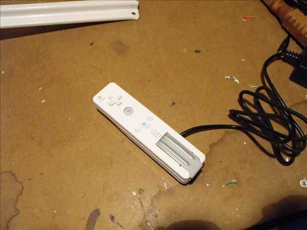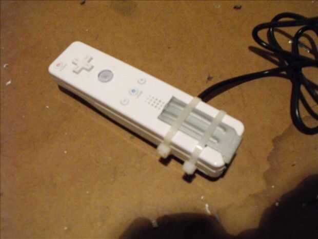 Ahora falta para asegurarse de que el wiimote se queda en modo de detección. Tomar la ranura del PC en blanco y cortar por la mitad. Coloque una de las mitades sobre el botón 1 y 2 en el wiimote. Finalmente consigue sus lazos de alambre y correa de la tierra para el wiimote. Esto sirve dos propósitos, sostiene los botones hacia abajo manteniendo el wiimote en modo descubrimiento hasta que encontró, y dos mantiene la batería firmemente la tapa en.