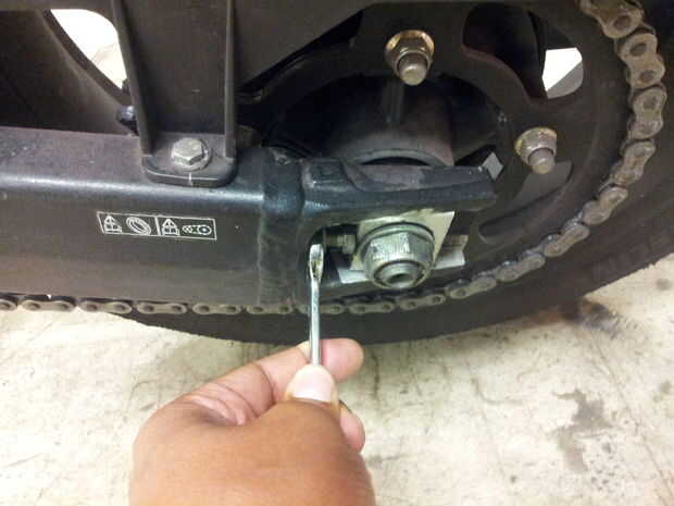 Si no tienes un calibrador para medir la posición de la rueda en el basculante se debe ajustar el lado de la cadena un cuarto ponga y ajuste el lado de la cadena no un cuarto de vuelta. Seguir adelante y atrás de esta manera para asegurar que la rueda se mantiene alineada.