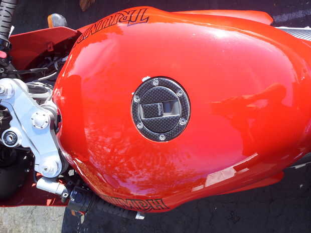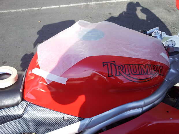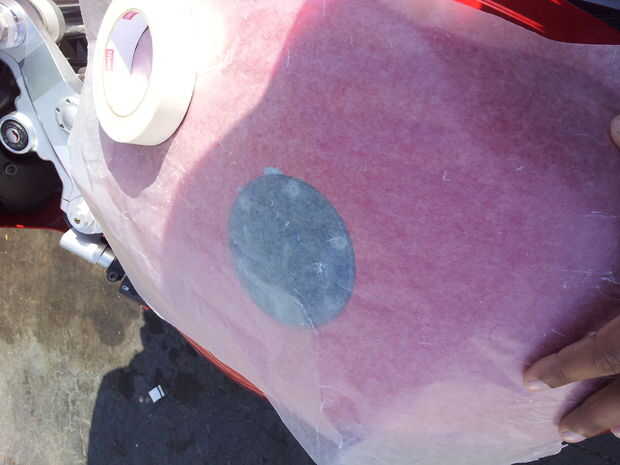 Me puso el papel cera sobre el tanque y había grabado hacia abajo con alguna cinta de enmascarar. Primero marqué el orificio de la tapa de combustible.