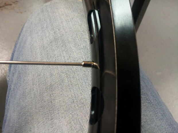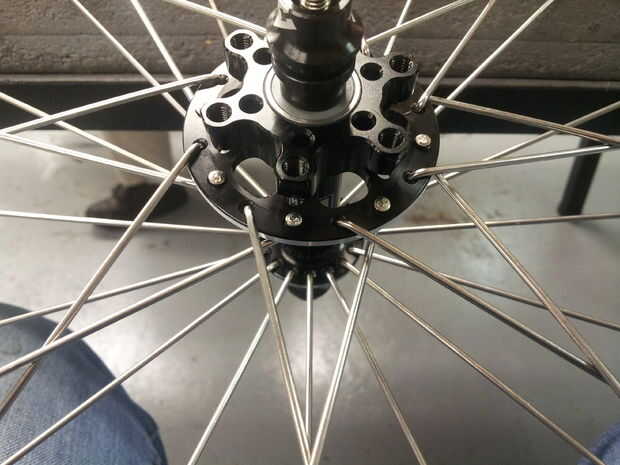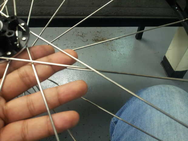 Con los radios de dos paso en mi mano veo donde alinean en el borde y cuando encuentro el lugar las líneas mejor Introduzca la parte superior en el agujero y añadir un pezón. Otra vez se enroscará el pezón hasta que no subprocesos están mostrando en la horquilla. A continuación a insertar el rayo inferior y apriete su pezón.
