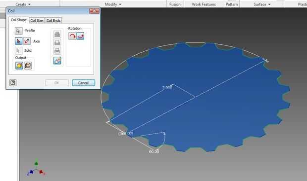 utilizar la función de bobina para definir y para sacar el engranaje helicoidal. Usé la altura y revolución para hacer mi equipo de 5" de altura, con un giro de 60 grados.
