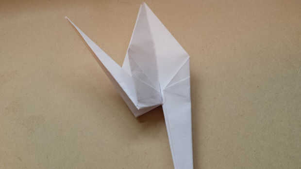 Este paso no tiene una línea de pliegue designado para que grúa de todos va a ser algo diferente en este punto. Extender las aletas del lado izquierdo un aplanador para que puedas empezar a doblar la punta hacia arriba. Como la punta empiece a arrugar en sí mismo, iniciar presionando que el lado izquierdo de nuevo juntos. Una vez en una colocación ligeramente diagonal, la prensa plana.