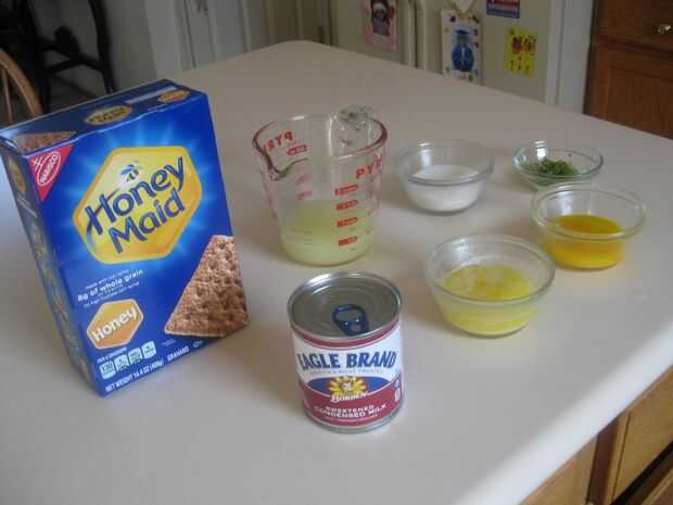 Para empezar, recoger y medir los ingredientes para asegurarse de que tienes todo que lo necesario. Para la corteza, necesita galletas, la mantequilla derretida y el azúcar. Para el relleno, usted se necesita huevo yemas, jugo de limón, ralladura de limón y leche condensada. Finalmente, para la crema batida, se necesita pesada para batir crema y en polvo de azúcar. Usé la receta aquí.