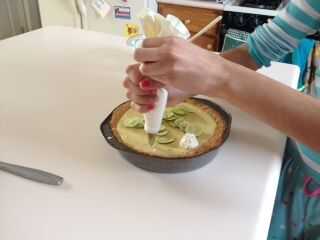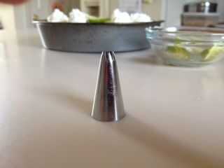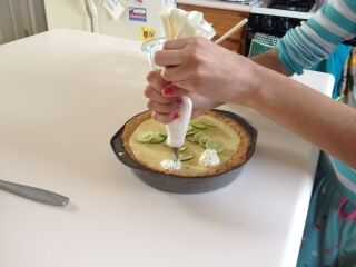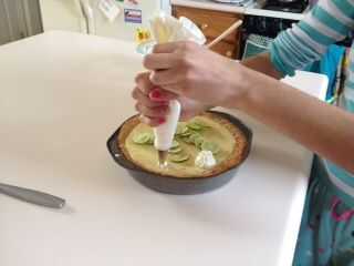 Esta es la parte! Cortar algunas rodajas de limón y me había montado una manga pastelera con un acoplador y la punta de la estrella de Wilton 21. Arreglé las rodajas de limón en un símbolo de pi por tener las rodajas se superponen sobre ellas y la línea en el lado derecho tiene una curva leve (acabo de añadir una rodaja de limón extra). Después de eso, yo vivo en 8 pequeños remolinos de crema batida. Usted puede hacer 12 o 6 Si desea; Hice 8 porque quería cortar mi pie 8. Así, habrá alguna crema sobre cada rebanada.