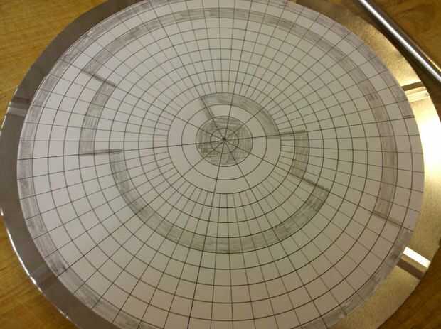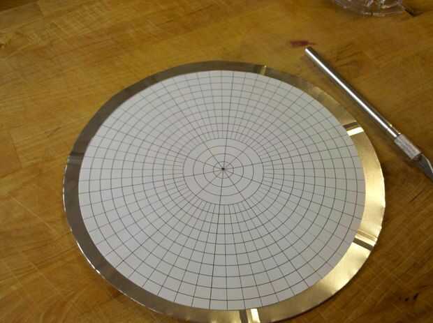 Cortar un círculo de 8.5" del centro de la pizzera. Utilicé un cortador de círculo para "marcar" el borde del círculo, luego un cuchillo hobby para rematar cualquier punto que no corte a través de todo el camino. También cortar el círculo en el papel de gráfico; debe ser aproximadamente de 8".
