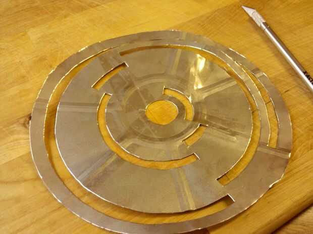 a continuación, cortar las partes sombreadas de la plantilla. Asegúrese de cortar a través el aluminio así. Encontré este más fácil hacerlo con un cuchillo de la manía, cortando un segmento a la vez. Cuando haya terminado, retire el papel restante.