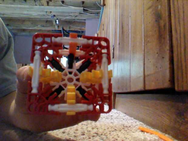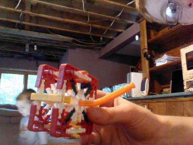 Poner barra naranja flexible en el agujero y empuje el conector blanco de otros. No empuje en otro agujero blanco. También tienes que poner una barra azul en un conector y al otro lado de ella encima del otro conector.