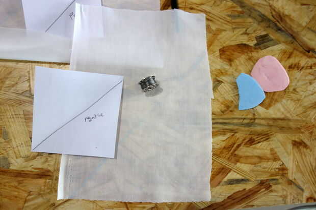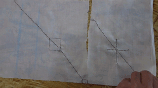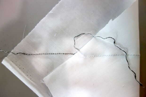 Tome dos piezas de tela más grande que los patrones cuadrados que cortan. Cosa diagonalmente a través de las piezas en diagonal. Puedes practicar en un pedazo primero. Compruebe la tensión de la máquina. Un buen truco para coser con hilo conductor de la bobina es bajar un poco la tensión del hilo superior para que el hilo de la canilla flota un poco. Esto a veces atascos de la máquina, sin embargo, así que tenga en cuenta.