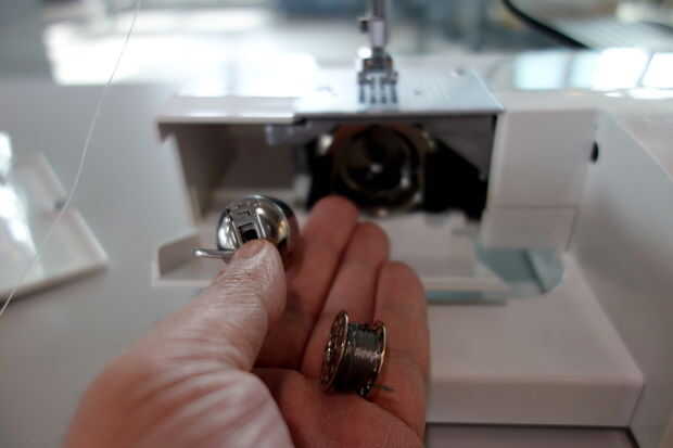 Para preparar a la tela, pop una bobina de hilo conductor en su máquina de coser. Puede enrollar su propio, o usted puede conseguir estas herida previa de varias fuentes como Adafruit, Sparkfun o Seeedstudio.