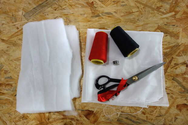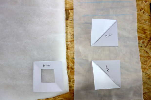 Cortar tres cuadrados de papel del mismo tamaño. Uno de ellos y corte un cuadrado pequeño en el centro. Coloque el uno con el agujero en el centro en el bateo. Esto va a ser el patrón que seguir. Cuando coser cosas juntos, siempre quiere dejar un poco de espacio en la tela para la costura. Así que precisar el patrón de papel en su bateo cortan fuera de los bordes del papel, dejando aproximadamente 5/8" de habitación a cada lado. Cortar la media también con un poco de margen de costura.