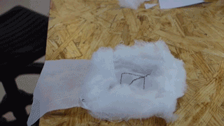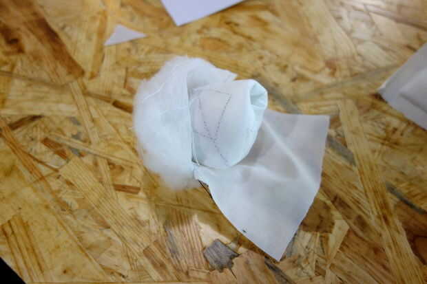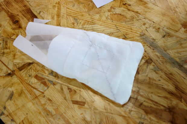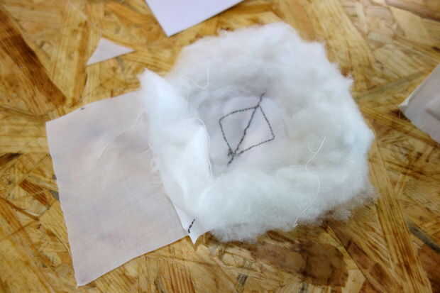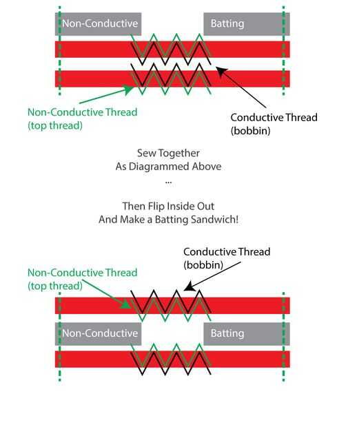 Tome el pedazo de tela con el patrón cuadrado conductor en el centro y colocar la guata en la parte superior, lado conductor hacia arriba. Línea para arriba por lo que el agujero en el bateo deja el patrón del conductor abierta. Prender las piezas juntas y coser con hilo no conductor.