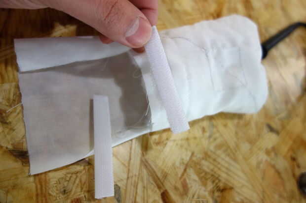 El borde final me gustaría ser capaz de abrir y cerrar a nuestro antojo para la depuración y actualización. Así que os adjunto algunos cinta velcro en las costuras. Por último, vas a querer sujetar este botón a tu Arduino u otro circuito suave. No quería poner el botón permanentemente a los cables del puente. Así que cosí en algunos broches de conductoras para el conductor hilos en su lugar, uno en para cada lado de la tela. De esa manera los conductores pueden desprendió cuando sea necesario.
