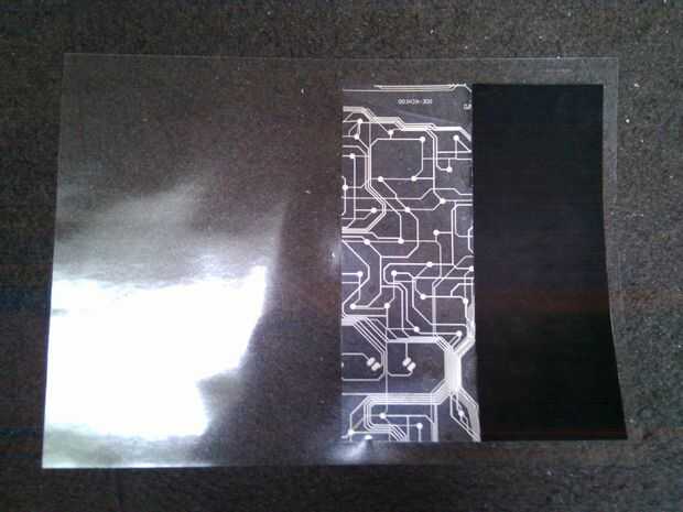 4) por último, pegué tanto hacia abajo en una hoja que lamina, como ves en la foto de abajo. Igual cuidado se requiere aquí para evitar burbujas. La foto de abajo es del lado no adhesivo de la hoja de laminado. Esto es el eventual fuera de la billetera, así que puedes poner cosas como desea ir fuera a buscar la forma que desee (decidí tener mi hoja de espejo con el lado plateado hacia afuera. La siguiente foto se toma desde el lado adhesivo de la hoja de laminado. Se puede ver el lado negro de la hoja de espejo, aquí.