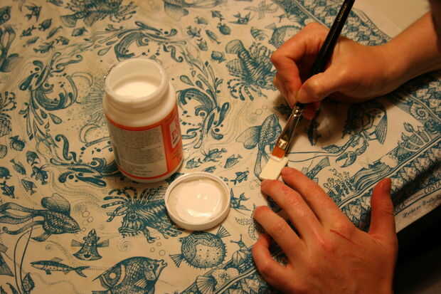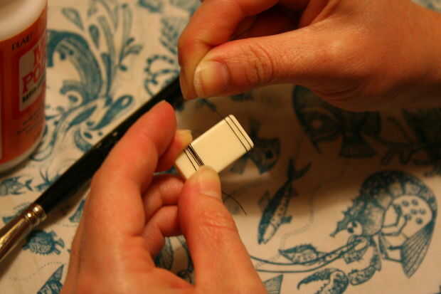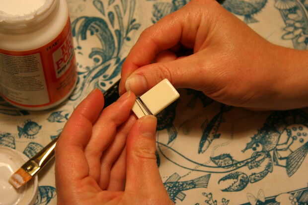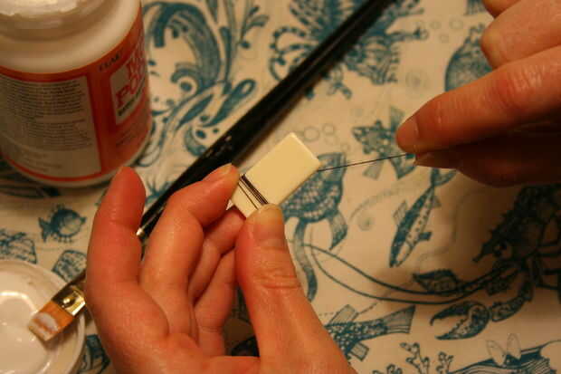 -Envuelva la rosca en el domino un par de veces extra para mantener el hilo en su lugar y aplique una capa delgada del decoupage. Apartar y dejar para secar.