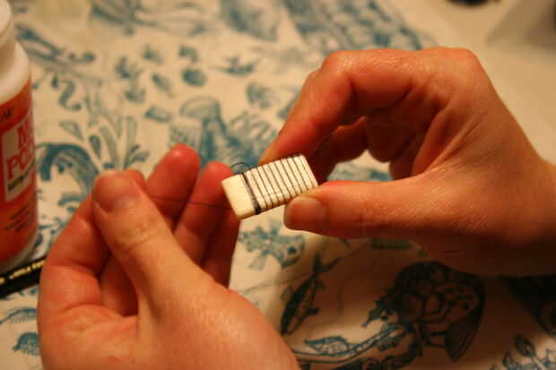 -Mientras que todavía ha mojado, viento el hilo unas cuantas veces alrededor en el lado izquierdo del domino para mantener el hilo anclan.