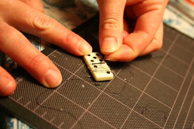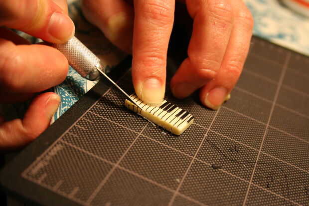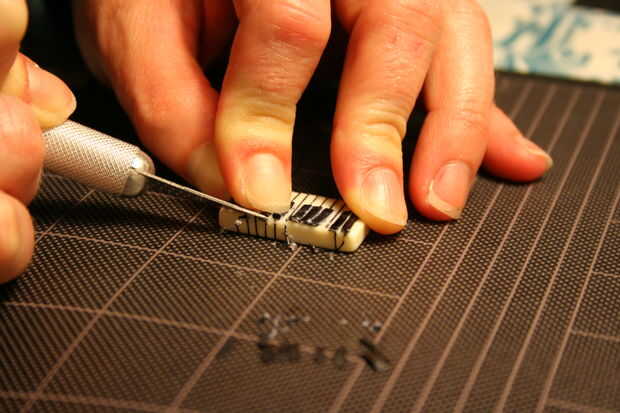 - Asegúrese que la pieza se ha secado completamente antes de que ajuste las teclas - unos 15 minutos. Luego vienen con el x-acto cuchillo en un ángulo de 45 grados contra el borde superior de la pieza. Presione en cada tecla para cortarlo - es fácil resbalar o bordes desiguales de papel si se intenta arrastrar el cuchillo en el lado de la pieza. Aparecerá una manera que es muy satisfactorio. No te preocupes corte en el domino de sí mismo - no mostrar.