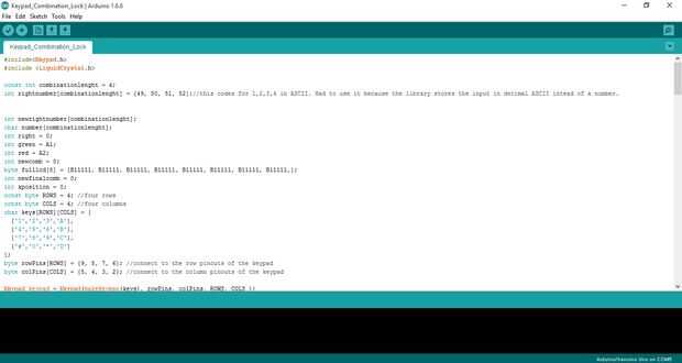 Aquí está el código para este proyecto. La combinación por defecto es 1-2-3-4. Para personalizar este código, se edita el array llamado "rightnumber". Es necesario poner el número en decimal ASCII. Esto es debido a cómo funciona el código y la biblioteca de teclado. Para editar la cantidad de números en la combinación, edita la variable denominada "combinationlenght". Sólo asegúrese de que su longitud de combinación no más de 14 dígitos, el código no está programado para manejar tal longitud. También asegúrese de que los partidos de longitud proporcionada combinación con la cantidad de número en el array "rightnumber", como si lo hace no se arruinara el programa. Si quieres acciones personalizadas para la combinación de bien y el mal, existe un vacío al final del código se llama "rightaction" y "wrongaction".