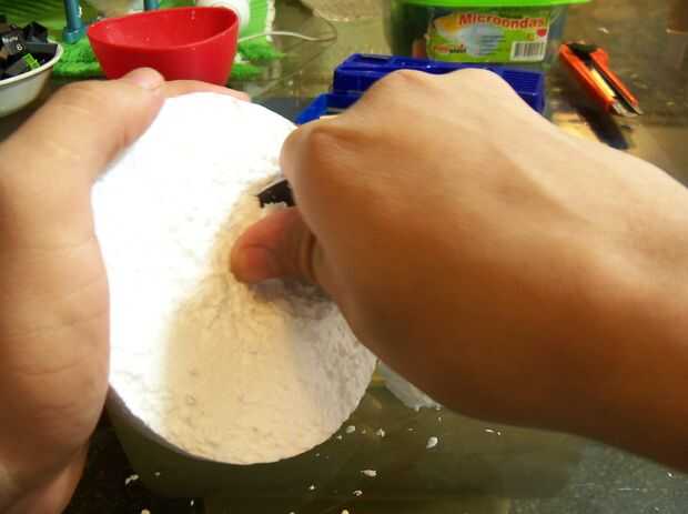 Puede usar los palitos para hacer espacios para la batería y las luces, como la última foto. El pequeño pedazo de espuma de poliestireno que se corta de la cúpula, funcionará como una base suave para los leds, por lo que sólo puede colocar en él como si fuera plastilina. En mi caso utilicé una pieza de 7 leds que venía de una linterna