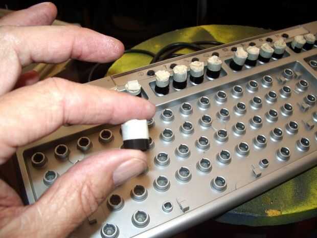 En lugar de tener este teclado aparte de la vivienda (tiene 104 goma círculo cositas en vez de un solo rollo como teclados más nuevos) bloqueado cada lugar donde una llave montada con tubería del vinilo 3/8 de pulgada con el extremo tapado con cinta adhesiva. Esto se hizo para mantener la pintura del interior donde montar las teclas.