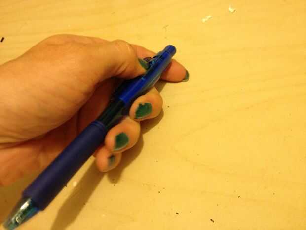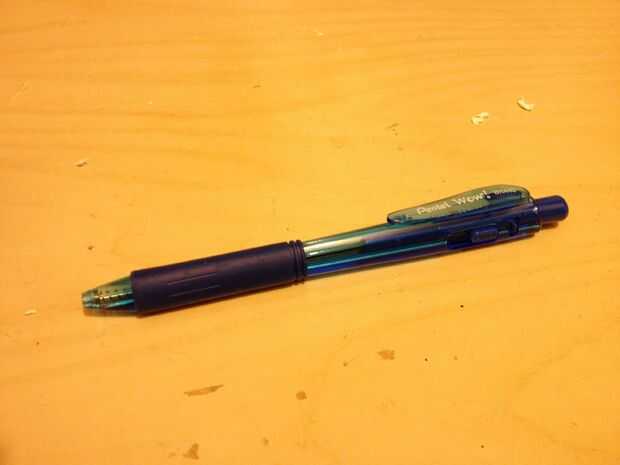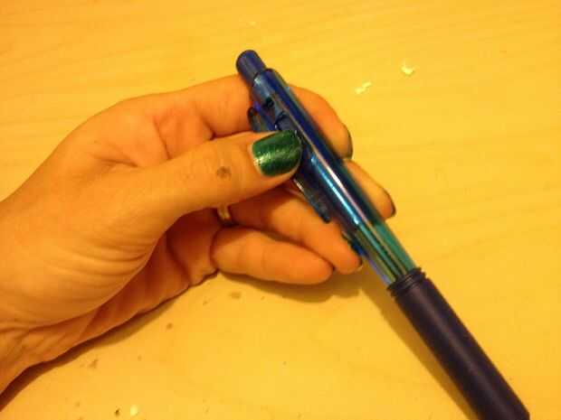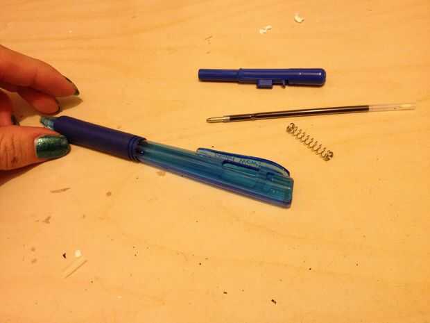 Los corrales son de grapas o cualquier tienda de suministros de oficina y presionando hacia abajo en esta ficha azul puede pop la tinta, haga clic en el botón y del resorte de la pluma.