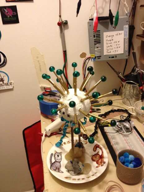 que necesitaba una manera de sostener la esfera mientras que agrega botones, así que quité el soporte temporal del rollo de alambre y construir un pequeño soporte de rocas, una placa y algunos repuesto cable y tubería. Nada funciona, el soporte es sólo para asegurarse de que la arcilla es bajo no hay estrés como se seca.