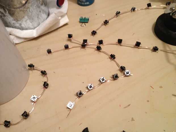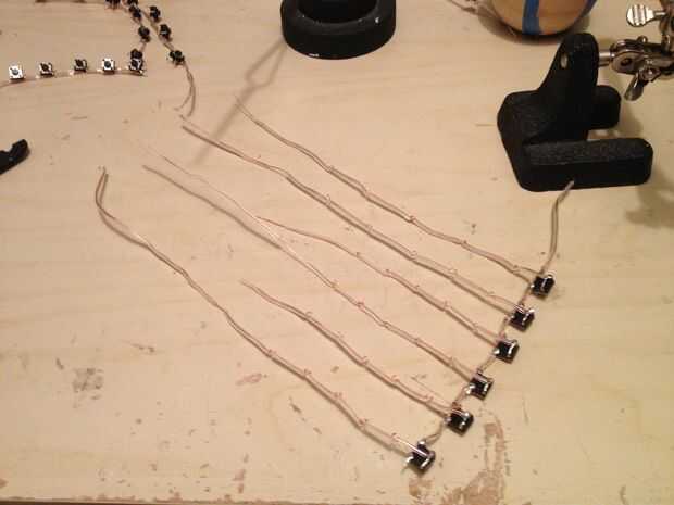 Uso de las restantes seis longitudes de alambre, una vez más cortan rebanadas en el aislamiento alrededor de 1,25 cm. Luego con cuidado unir las filas de botones. Voltea la cuadrícula entera y cuidadosamente las espaldas de todas las filas y columnas en lugar de la soldadura.