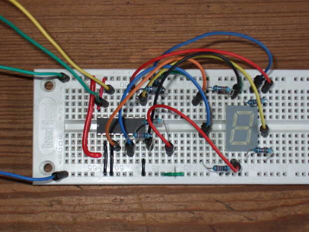 El ánodo común del display de 7 segmentos está conectado a 5V de la fuente de alimentación. Los otros pines se conectan con los pines I/O del chip I2C (usando resistencias de limitación actual de 330 ohmios).