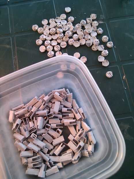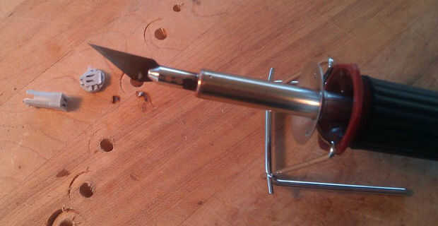 Con buena ventilación, utilizar un cuchillo caliente (accesorio de una herramienta de la estufa de leña) para cortar de la parte superior de las teclas de los tallos. En retrospectiva, que podría haber sido mejor hacerlo lijando apagado más de la parte superior en un cinturón o una lijadora de disco y deja algunos restos finos de la tapa llave redonda en el tallo, para un enlace de pegamento más firme a las teclas de madera. Pero yo los romperé todo. Intente cortar perpendicular al tallo, lo más cerca posible de la parte superior se eliminan. Algunos tallos corté demasiado de la parte superior, y estos eran inútiles. Tenía una mina de otro teclado de teclas adicionales. Usted será lijar un poco más adelante así que no te preocupes si no recortas perfectamente perpendicular.