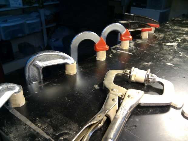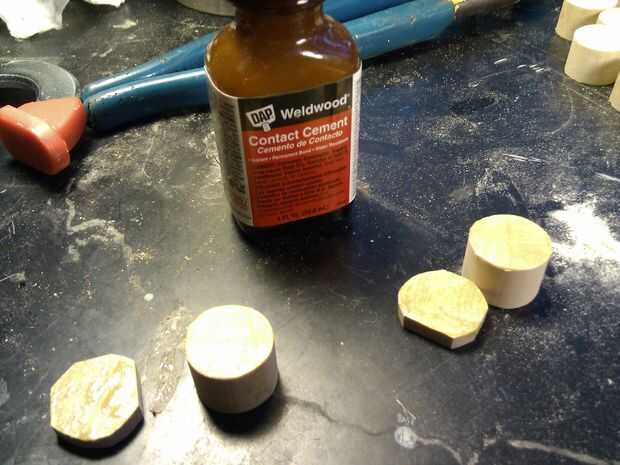 Aparece un montón de pinzas listas de cualquier tipo que se puede encontrar. Prensas, mordazas tornillo de banco, abrazaderas de tipo c, sea cual sea. Preparación claves por lotes determinan por cuántos tornillos tiene. Pintar la parte superior de una pieza de pasador de 14mm con cemento de contacto Weldwood y también la parte inferior de la ficha de la letra. Deje que ambos secar hasta hortera. Cuidadosamente coloque los dos y tocar juntos. Este pegamento es rápido, por lo que sólo te dan una prueba aquí. Poner el par pegado en una de sus pinzas para secar por varias horas. Utilizar alguna madera fina o goma para proteger la madera si la abrazadera tiene mordazas que lo podrían dañar. Repita el X 25.