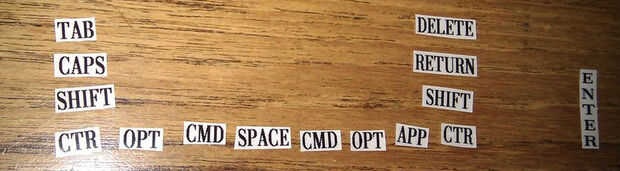 Utilizar a un rotulador con cinta etiqueta clara para generar todas las etiquetas para las teclas de letra no. En la foto, es blanco adhesivo respaldo detrás de la cinta. También podría utilizar Letras de transferencia o impresión del laser en hojas de transparencia, o simplemente dibuja símbolos sobre las teclas Si eres realmente bueno en ese tipo de cosas. He probado usando una estufa de leña, también, que era un poco demasiado campechano para mí. Corte como gran parte de la cinta del símbolo como sea posible con unas tijeras finas, desprenda la parte de atrás y pegarlas con cuidado a las teclas con las pinzas.