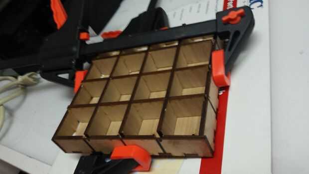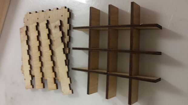 Me tiró el archivo PDF resultante en CorelDraw y luego utiliza copias de un lado para hacer las ranuras cruzadas. También he añadido los agujeros de 3mm para los cables del hilo de rosca. Si obtienes 5mm de madera contrachapada, puede utilizar mi archivo de diseño.