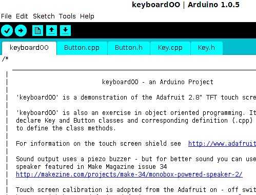 Cinco archivos son necesarios. keyboardOO.ino - el bosquejo principal, dos archivos de cabecera Key.h y Button.h y dos archivos de la aplicación, Key.cpp y Button.cpp.