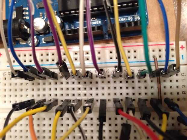 2. a continuación, el otro extremo de cada trenzado 22AWG saltar alambres con puntas sólidas se enchufarán en protoboard 1. Asegúrese de mantener cada paralelo cable a todos los otros cables (es decir, sin cables de superposición/travesía) y asegúrese de que cada cable tiene 1 agujero de protoboard entre sí mismo y el cable a ambos lados de la misma.