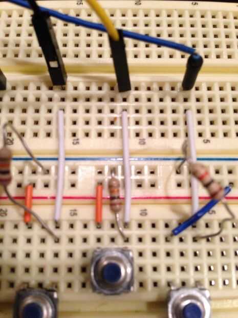 2. (ver cuadro 2 para la referencia): arreglar pulsadores como se muestra a continuación. Asegúrese de que cada botón es agujeros de dos protoboard espaciados apartes. Además, asegúrese de que cada botón de la nota aguda (vea la etiqueta de arriba) tiene sus dos clavijas más cercanas a la línea positiva estas en antes de conectar pulsadores de sharp-Nota 2 protoboard para que haya espacio (un agujero) en cada fila de un lado de la resistencia de 10k-ohm telecine a fijarse. También, asegúrese de que pulsadores están correctamente orientados. Las clavijas 1 y 3 o 2 y 4 son (un par) más cercana a la línea positiva. De lo contrario, si se gira 90 grados, los botones no funcionan.